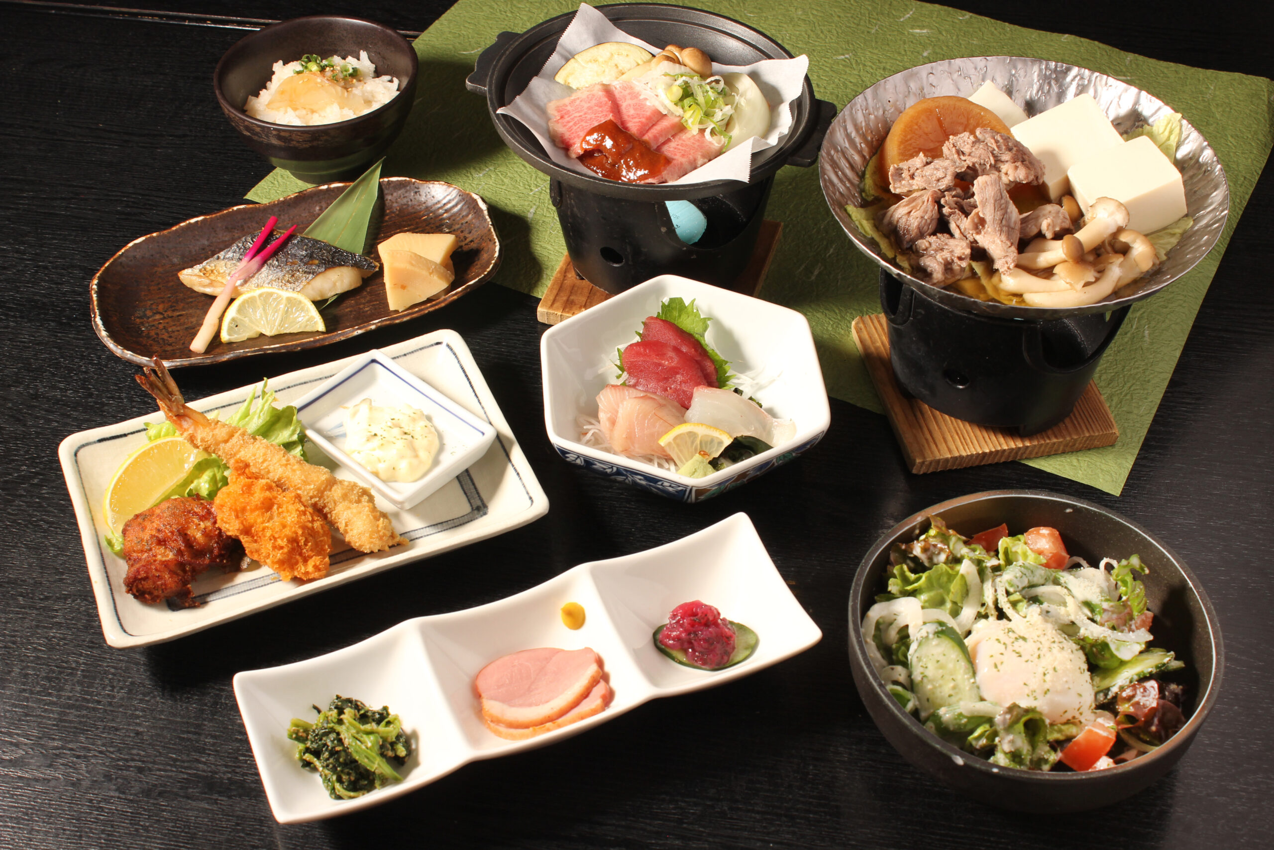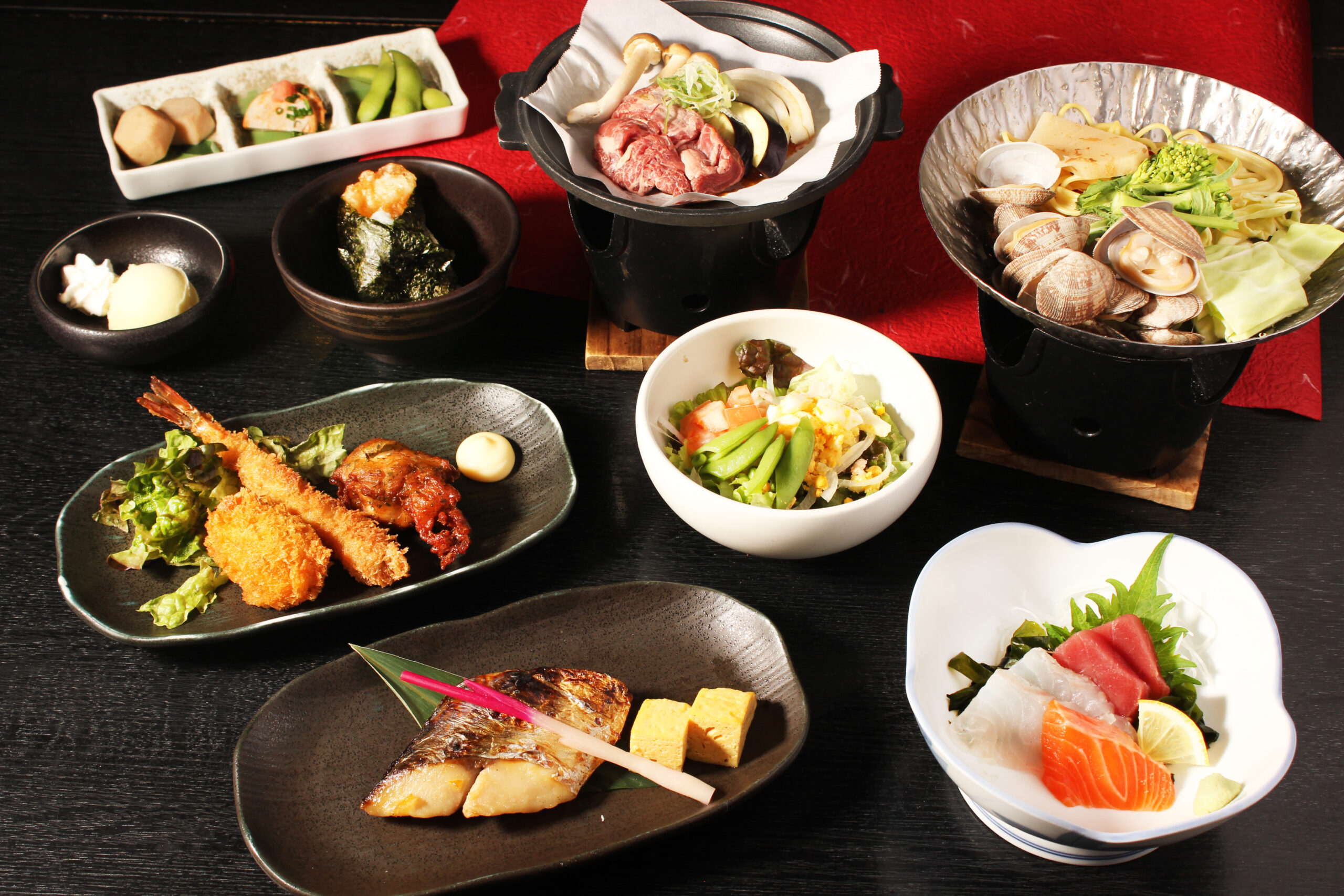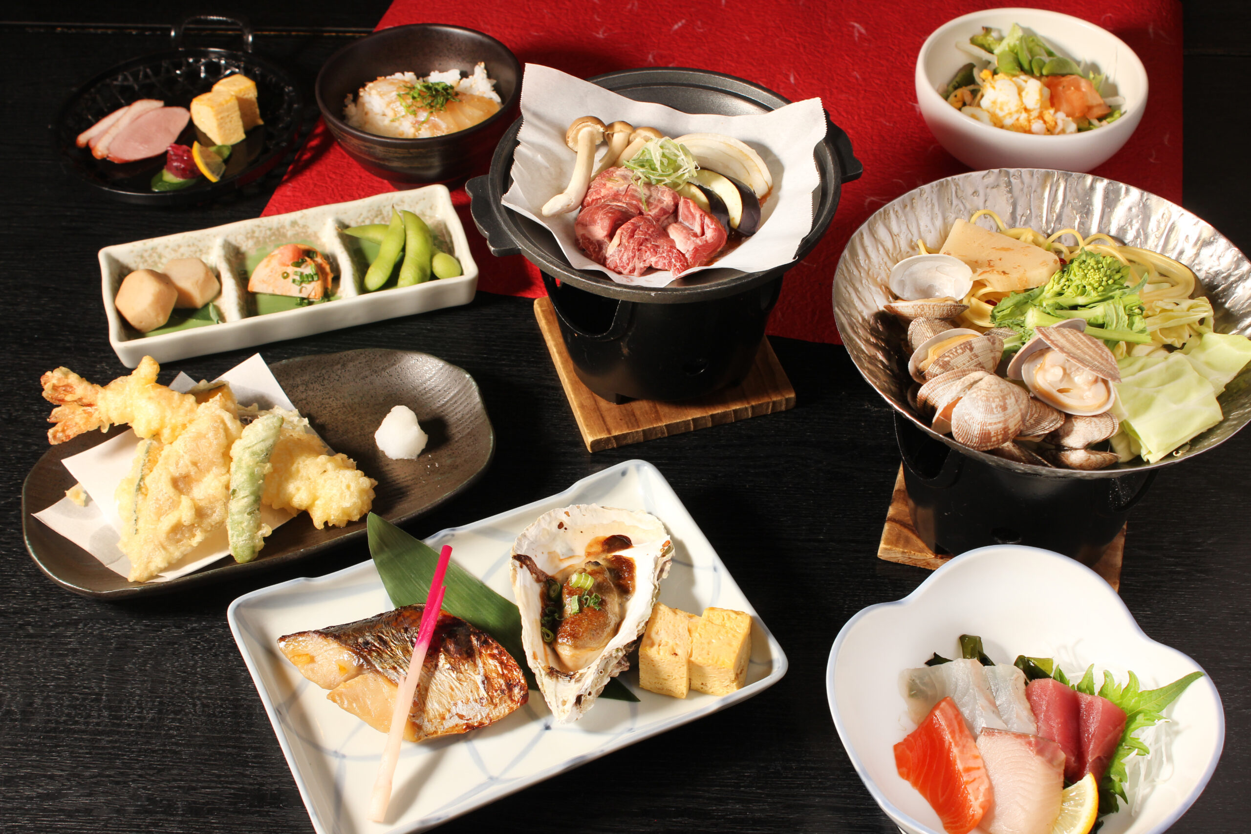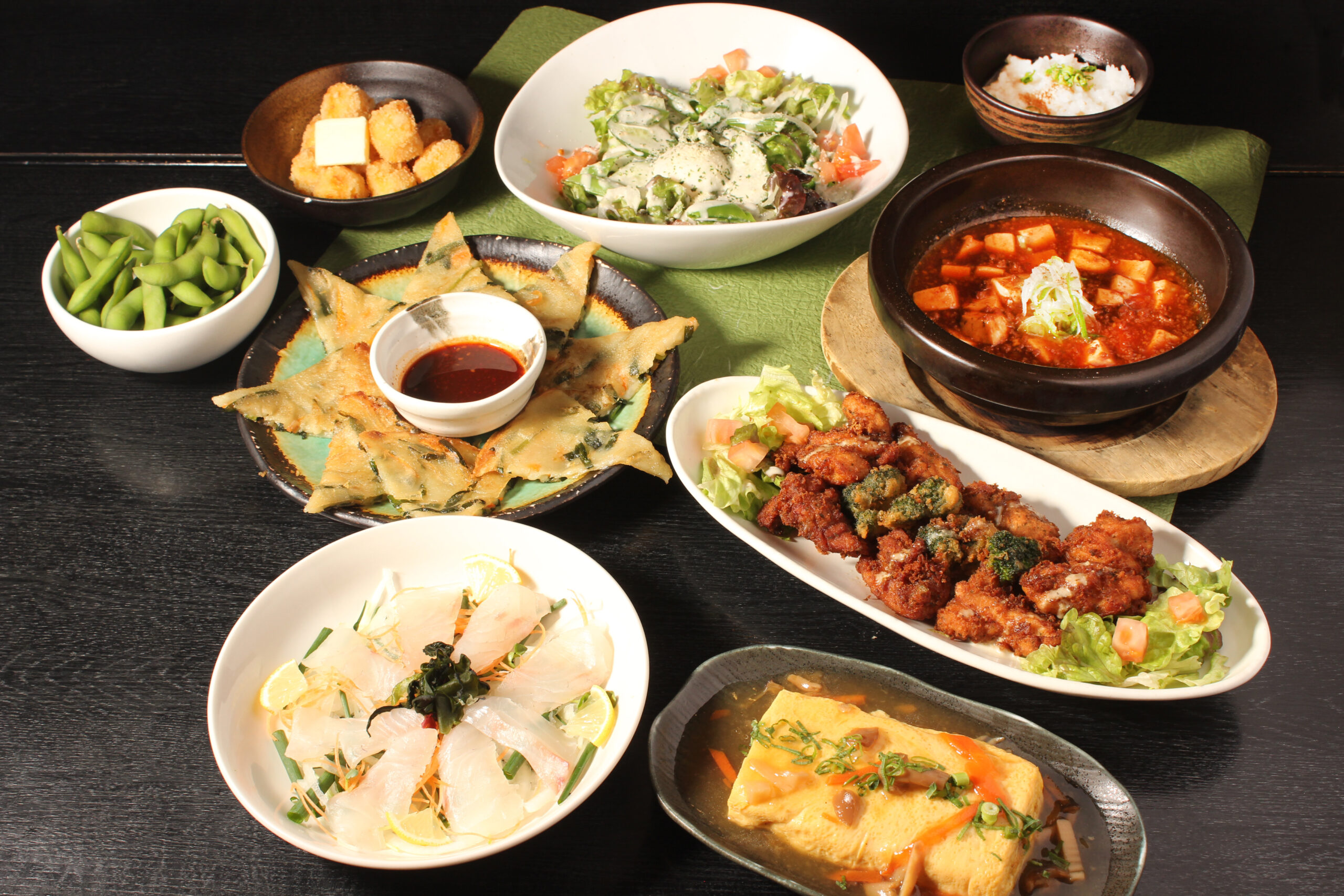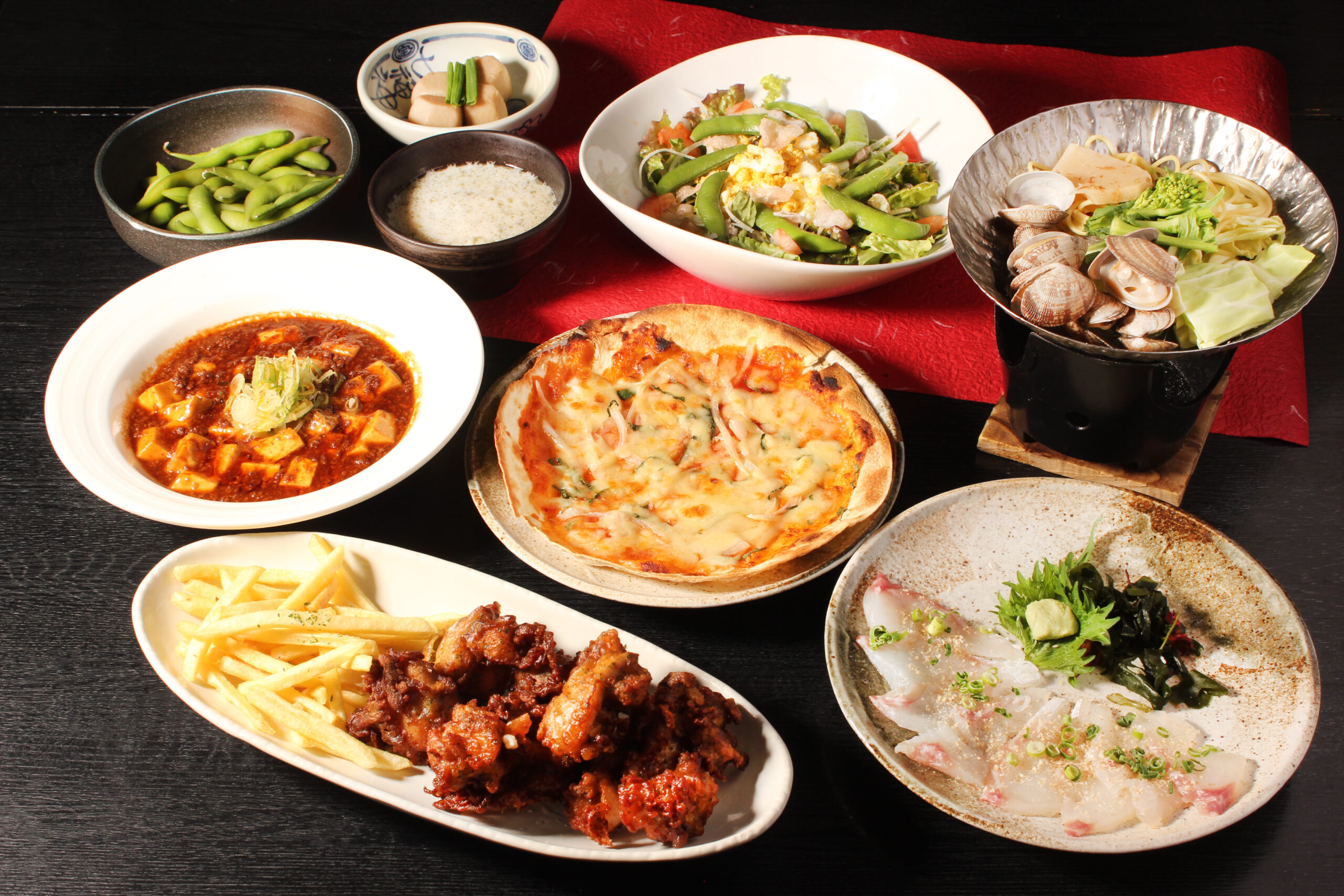みんなでワイワイ大皿【いい日旅立ちコース】コース品数:9品/利用人数:2名~料理のみ3,850円(税込)/飲み放題付5,000円(税込)◇前菜2種 +800円で、通常1080円のハレパンの純生食パンをおみやに出来ます。 |